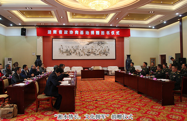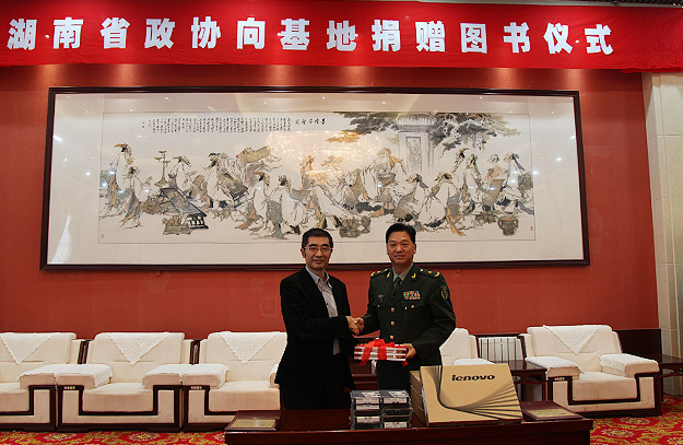 24日,“湘水情长”——湖南省政协委员文化拥军活动捐赠仪式在酒泉卫星发射基地东风宾馆举行,湖南省政协副主席张大方代表省政协向基地负责同志赠送图书(目录)、笔记本电脑、电子书等,并向参加捐赠的委员单位颁发证书。基地负责同志致答谢词,对湖南省政协的文化拥军活动表示赞赏,并表示将推动湖南双拥工作的开展。
