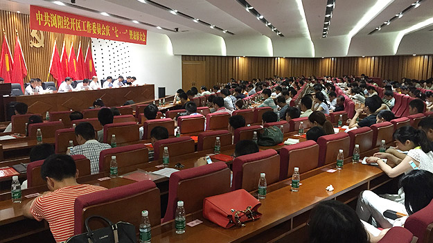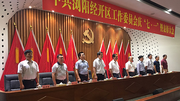 在庄严的国际歌声中,大会开启帷幕。首先,园区党工委委员、纪工委书记杨围山同志作了题为《适应全面从严治党新常态、推动党建工作再上新台阶》的党建工作汇报。他围绕夯实党建基础,切实履行党建工作主体责任、着眼基层,有效推进党的基层组织建设、与时俱进,努力提升党员干部队伍素质、践行群众路线,不断增进人民群众血肉联系、转变作风,着力打造务实清廉执政环境等五个方面阐述了如何狠抓创先争优。接着,园区党工委委员、管委会副主任刘良成同志宣读了中共浏阳经济技术开发区工作委员会关于表彰2015年度先进基层党组织、优秀党务工作者和优秀共产党员的通报。