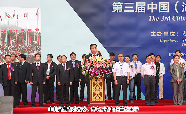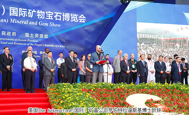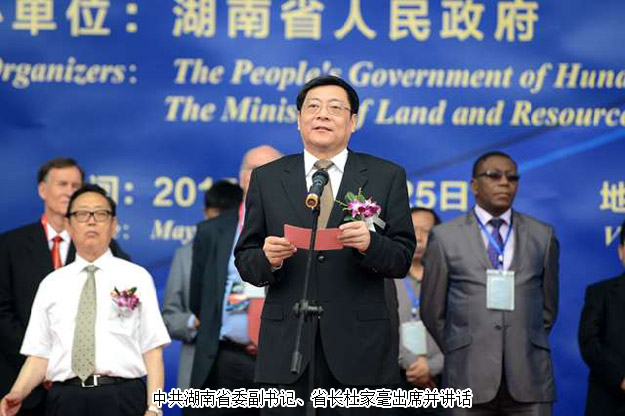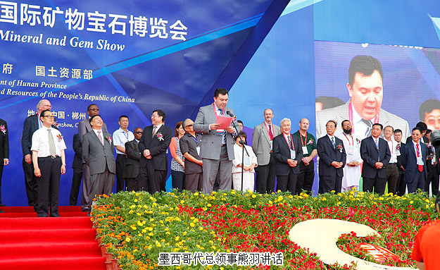 开幕式上,郴州市委书记易鹏飞、国外展商代表罗伯特•拉温斯基、墨西哥代总领事熊羽分别致辞。美国图森展原主席彼得•梅高、澳大利亚昆士兰博物馆联盟主任苏珊•米勒、美国著名矿物宝石收藏家基因•梅尔安等境外嘉宾,中国科学院院士莫宣学,国土资源部、湖南省委、省人大、省政府、省政协领导,国家相关部办委领导,矿博会组委会成员单位领导,行业协会、矿山企业、参展商代表,50多家新闻媒体记者及群众代表等参加了开幕式。