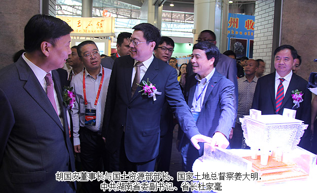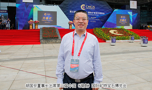 2015年5月21-25日, 由湖南省人民政府和国土资源部联合主办,省国土资源厅、长沙市政府、郴州市政府等联合承办的第三届中国(湖南)国际矿物宝石博览会在郴州举行。国土资源部部长、党组书记、国家土地总督察姜大明宣布第三届矿博会开幕,湖南省委副书记、省长杜家毫出席开幕式并讲话。中共湖南省委常委、常务副省长陈肇雄主持开幕式。湖南省工商联(总商会)副会长、安博官网董事长胡国安受邀出席开幕式,并陪同国土资源部部长、党组书记、国家土地总督姜大明,中共湖南省委副书记、湖南省人民政府省长杜家毫等领导一行视察展馆。