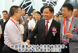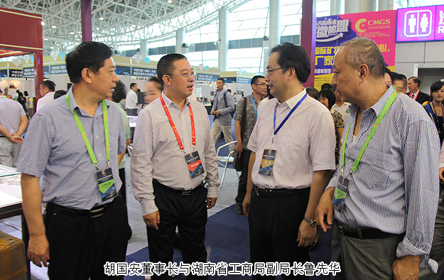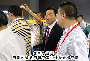 陪同领导巡馆以后,胡国安董事长对本次矿博会成功举办高度评价:“国际矿博会的举办,让‘湖南走出去’战略得到了充实提升。这么多国家参展,必将吸引全世界的目光,这对于湖南文化和湖南经济社会来说,是一个天然的展示机会。湖南应充分利用博览会搭建的平台,‘把会展与文化、旅游、科技、信息、商贸、物流更好地结合起来,着力推动会展经济和现代服务业加快发展’”。他表示:湖南地处中国中部城市要冲,无论是地理位置还是区位优势来看,都是属于发展要冲,加上洞庭湖国家级生态经济区和长江经济带的确立,更突显了湖南的发展优势。推动会展经济发展,这是现代经济发展的一个重要支撑,如果与湖湘文化和大湘西旅游资源及商贸物流进行融合发展,这就让湖南经济具备了强大的内生动力,为湖南改革开放提供了一个天然的通道和平台。所以,我们既要关注这次郴州矿博会的盛况,更要与湖南未来的发展结合起来看,目光不限于一隅,思路才会天地阔。