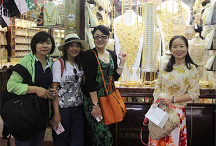 迪拜一度被誉为黄金城,当地的黄金亦一度因为金价低于邻近中东各国而造成大量外流。绿之韵人彻底领略了一把什么叫真正的金碧辉煌。由于阿拉伯人对黄金情有独钟,所以这里的黄金首饰工艺也特别精致别致,是国内完全没法比的,各式夸张的珠宝金饰,你只有在电影里的国王和皇后身上才会看到。伙伴们钟爱的黄金一起合影,更不忘把看中的心爱之物收入囊中。