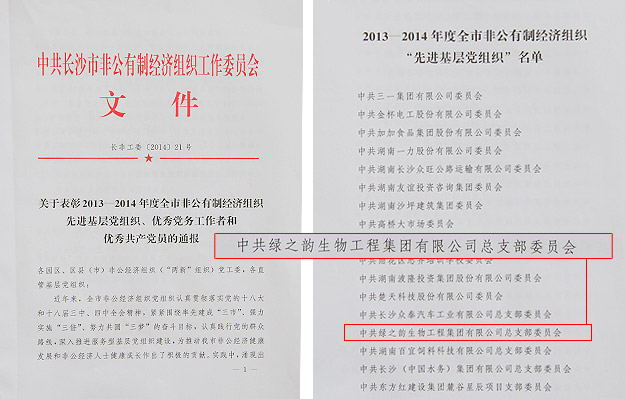 会议学习贯彻了中共中央、中共湖南省委、中共长沙市委党的群众路线教育实践活动总结大会的精神,对全市非公经济组织教育实践活动进行了总结。中共长沙市委常委、市委统战部部长文树勋,市政协副主席、市工商联主席彭继球参加会议。会上,作为长沙市非公有制经济企业中党的群众路线实践教育学习典范,绿之韵党总支部凭借一系列优秀党建、团建工作荣获2013—2014年度长沙市非公有制经济组织“先进基层党组织”荣誉称号,安博官网党总支部书记许达仲、副书记罗婷出席会议并接受表彰。
