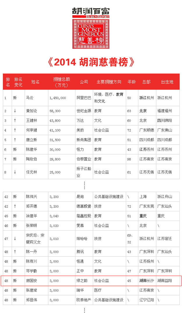 10月28日,《2014胡润慈善榜》正式对外发布。在这份榜单当中,5家直销企业纷纷上榜,安博官网位列第4。在本统计年度中有3位非企业家身份的慈善家上榜,分别是朱镕基、徐绍村和李春平。前100位上榜慈善家变化巨大,有71位新上榜慈善家,历年最多。从总体来看,前100名上榜慈善家中,有18位新的地区首善;从出生地来看,有13位新的地方首善诞生。本次包括胡国安董事长在内,湖南仅有两位企业家上榜,胡国安董事长捐赠3000万元,位列第48位。阿里巴巴的马云以145亿元捐赠额刷新中国慈善记录,成为新一届“中国最慷慨的慈善家“;世纪金源的黄如论以5.8亿元的捐赠额排名第二;60岁的王健林以4.4亿元的捐赠额位列第三。