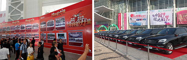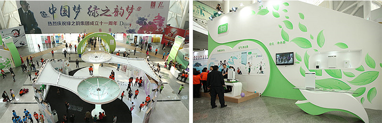 进入湖南国际会展中心嘉年华活动入口处,印入眼帘的气势恢宏的企业文化历程立体展板。与时代同行,与祖国同行,该展示区域从水的精神、家文化、企业经营宗旨、产品理念、核心价值观、历史使命、愿景规划等多个方面直观、形象和生动地细数了绿之韵十一年文化传承、辉煌发展之路。