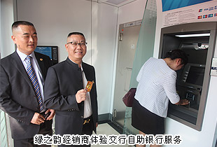 揭幕仪式后,绿之韵经销商代表张建军、黄翔、沈慧芳等亲身体验了交行自助银行服务;参与本次活动的经销商、市民现场咨询、办理了相关银行业务。