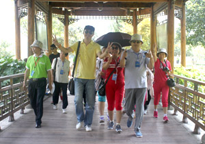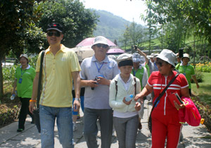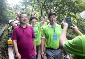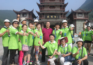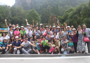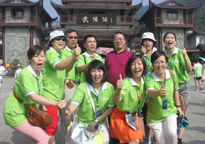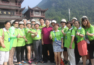 第二天,最让伙伴们感动的是:伙伴们正准备挺进武陵源景区大门时,突然见到尊敬的胡国安董事长顶着炎炎烈日、大汗淋漓、在百忙之中走到我们中间,与所有伙伴一起游览十里画廊,并一一合影留念。胡董事长说:“爬山好比我们绿之韵事业,开始会有很多的憧憬、愿望、怀疑、忧虑,当我们一步一个脚印前进时,发现在前行的过程中有很多美丽的风景、可爱的伙伴,但是,也会遇到恐惧、坎坷。在这过程中,有鼓励你的人、也有打击的人,关键是自己的毅力与耐力是否能战胜自己。不管怎样,我愿意陪伴大家一起走向成功的顶峰。”胡董事长真是太神奇了,他之前的一番话,伙伴们在爬山过程中几乎全部遇到了。当伙伴们爬过一个小山丘时,有人开心的不得了,尤其是站在山腰往下看到美丽的山与大树时更是欣喜若狂。大家鼓足勇气,一鼓作气爬到了顶峰,每个人的脸上都露出了胜利与幸福的笑容!