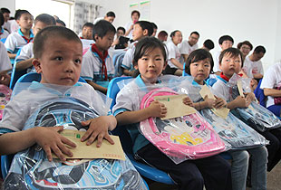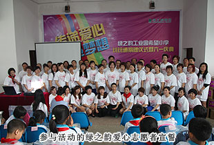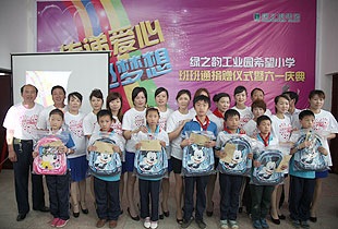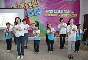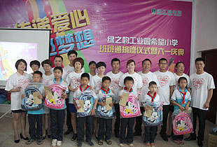 少年强,则中国强。关注少年,传递爱心,放飞梦想。 捐赠仪式上,22个来自贫困家庭的孩子还得到了特别的六一礼物,由现场爱心志愿者们捐赠购买的爱心书包以及共同筹集的爱心款。满腔关爱有如涓涓细流汇入孩子们的心田,汇爱成海是我们绿之韵慈善志愿者的共同志愿。正如仪式上四位党团支部成员舞动的手语舞“让爱传出去”,让我们将爱传出去,传遍神舟四海。所谓万涓成水,必能 汇爱成海!