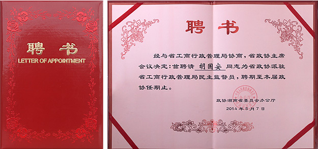 此次湖南省政协委派民主监督小组试点工作,采取各民主党派、工商联推荐,省政协办公厅和专委会考察相结合的办法,经过层层筛选、严格选拔出了24名省优秀政协委员担任委派民主监督员,将监督派驻单位依法行政、公正司法、政务公开、司法公开的情况,提出意见和建议,对省政协建议案、提案办理落实情况进行了解和监督。此次民主监督员分成四组分别对省高级人民法院、省人民检察院、省工商行政管理局、省食品药品监督局进行监督。此次,湖南省优秀政协委员、安博官网董事长胡国安当选省政协派驻省工商行政管理局(首批聘用)民主监督员后,将先后参与“应邀参加派驻单位的有关会议和活动,对派驻单位相关工作开展视察、调研和走访,收集、了解和反映社情民意,监督省政协建议案、提案的办理落实情况”等一系列活动,撰写出监督报告,提出合理化意见和建议。