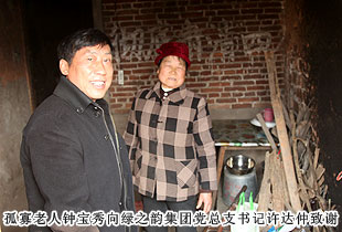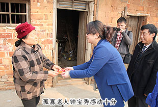 最后,慰问小组来到的是两位孤寡老人家,他们分别是69岁的钟宝秀和70多岁的老党员黄军辉。钟宝秀老人,本是四口之家,奈何因家族性精神病史,丈夫与两个儿子先后离世,让她从此孤苦无依。黄军辉老人则是一位老共产党员,曾经还是荷花片妇女主任,如今年年被评为村里的先进分子。老人精神很好,向慰问组组员们一一道谢,还直言道:“你们又送钱又送东西,却茶都不喝一口,这叫我怎么好意思!”