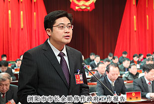 12日上午8时30分,大会在庄严的国歌声中开幕。大会由浏阳市人大常委会副主任孙建科主持。会议应到代表381名,因事因病请假6名,实到375名,符合法定人数。浏阳市人民政府市长余勋伟作政府工作报告。报告全面回顾了2013年工作,提出了2014年政府工作的总体目标和主要措施。过去一年,浏阳市紧紧围绕“挺进三十强、再创新辉煌”目标,团结拼搏,克难奋进,扎实推进各项工作,较好地完成了市十六届人大二次会议确定的各项目标任务。全年实现地区生产总值940亿元,增长14.5%;完成财政总收入75.9亿元,增长37.3%;完成固定资产投资568亿元,增长30.5%;实现社会消费品零售总额179亿元,增长13%;城乡居民人均可支配收入达24120元。地区生产总值、工业总产值、财政收入等主要经济指标增速居长沙九区县(市)第1位,城市创新能力居全国第48位、全省第1位,县域经济与县域基本竞争力挺进全国前50强,由第60位跃升至第47位,进位速度居全国百强之首。
