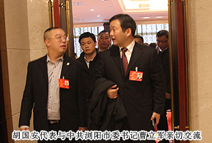 胡国安代表在与中共浏阳市委书记曹立军亲切交流时,还表示:“2014年,我将牢牢把握团结、民主两大主题,紧紧围绕市委市政府的决策部署,切实履行职能,多思发展之计、多献惠民之策、多促利民之事,充分发挥协调关系、汇聚力量、建言献策、服务大局的人大代表作用,为尽快实现“挺进三十强、再创新辉煌”,率先全面建成小康社会目标作出新的贡献!”