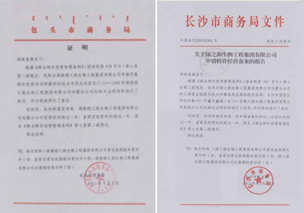 2013年12月26日,绿之韵生物工程集团有限公司(以下简称安博官网)正式获得国家商务部的企业特许经营备案,备案登记号为:0430100711300045,网站信息查询: http://txjy.syggs.mofcom.gov.cn/manager/prosecute.do?method=add&id=3527302