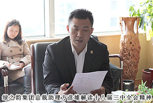会上,胡国安董事长作出了重要精神指示,“十八届三中全会”其改革领域涉及到包括转变政府职能、缩小收入差距、打破行业垄断、户籍制度改革、土地制度改革、金融体系改革等一系列关系国计民生的重大事项。通过今天的学习,希望大家提高自我认识,加深了对党中央精神的理解,要对国家未来的改革充满期待,对未来的发展报以坚定的信心。新时代、新时期、新改革,除了做好本职工作,也要时时处处关注国家政策和改革发展动态,从改革方案中看到新信息、新希望、新起点。大家只有找准个人梦想、企业梦想、产业梦想与国家政策结合的正确基点,也才能让“中国梦,绿之韵梦”早日实现!