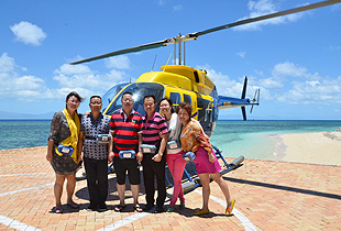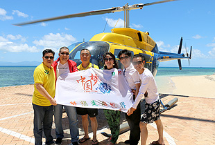 深蓝的海水会让人害怕,总觉得平静的海水下面有很多可怕的生物。可是这种比淡蓝深一点,比深蓝浅一点的海面,美得让人都快窒息了。这么美得景色无法用语言来形容,只能静静感叹大自然的魅力和神奇,不愧为世界八大奇迹之一。色彩绚丽的珊瑚和逾万种独特海洋物种构成的海底奇景在直升机和潜水两项活动中感受得淋漓精致。在凯恩斯乘坐热气球、直升机,在八百米的高空俯视晨曦中的大地,当热烈灿烂的朝霞映红脸膛的刹那,心境也豁然放达开来。在2000多米高的云雾间飘乎游荡,呼吸着沁人肺腑的凉气,凌空俯瞰成群的袋鼠在丛林溪流中嬉戏跳跃。俯瞰大堡礁,美得如梦如幻,这是一般人难以想象的体验。胡国安董事长与大家一起乘坐直升飞机,绿之韵事业给每一位事业伙伴带来“翱翔”的机会!绿之韵人的惊声尖叫与纵情欢笑撒满整个天空与海面,久久回荡。