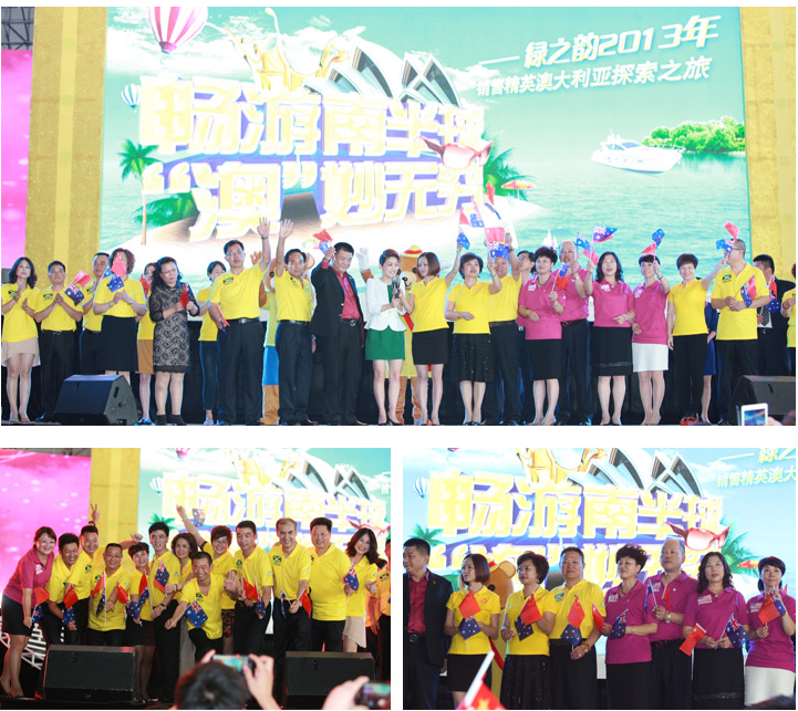 荣耀与激情碰撞,成功与收获交汇。在绿之韵平台上,从来都不缺乏成功圆梦者的身影,十周年庆典之际,又有一群梦想者飒爽英姿,斩获荣光。2013年绿之韵营销精英澳洲旅游欢送仪式在发布会上隆重举行欢送仪式。董事常务副总裁劳嘉宣读嘉奖令,并为即将启程澳洲旅游的家人们送上了诚挚的祝福。